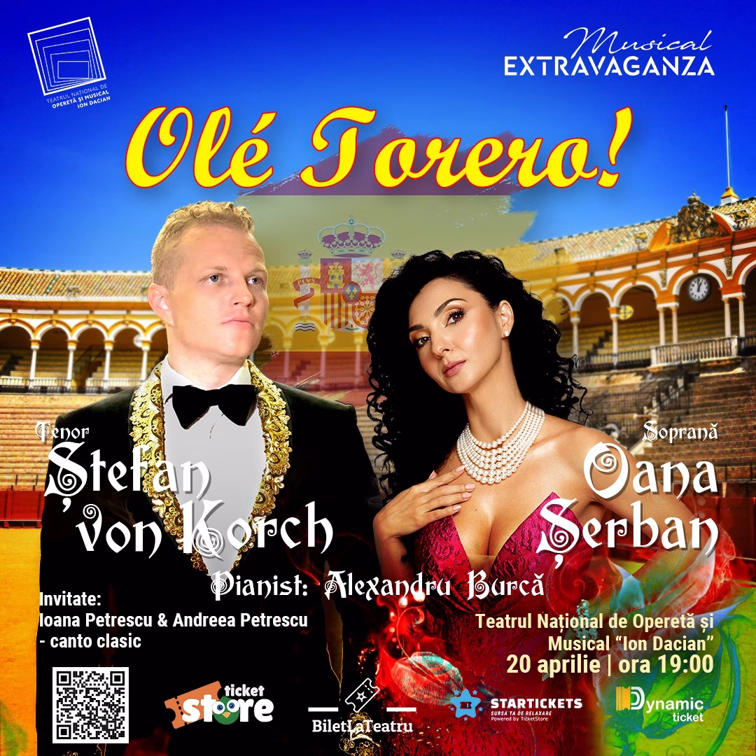 Pe 20 aprilie, Teatrul Național de Operetă și Musical „Ion Dacian” găzduiește concertul „Olé, Torero!”, un spectacol care promite să aducă în fața publicului farmecul incandescent al muzicii iberice, într-o seară dominată de pasiune, ritm și strălucire vocală....